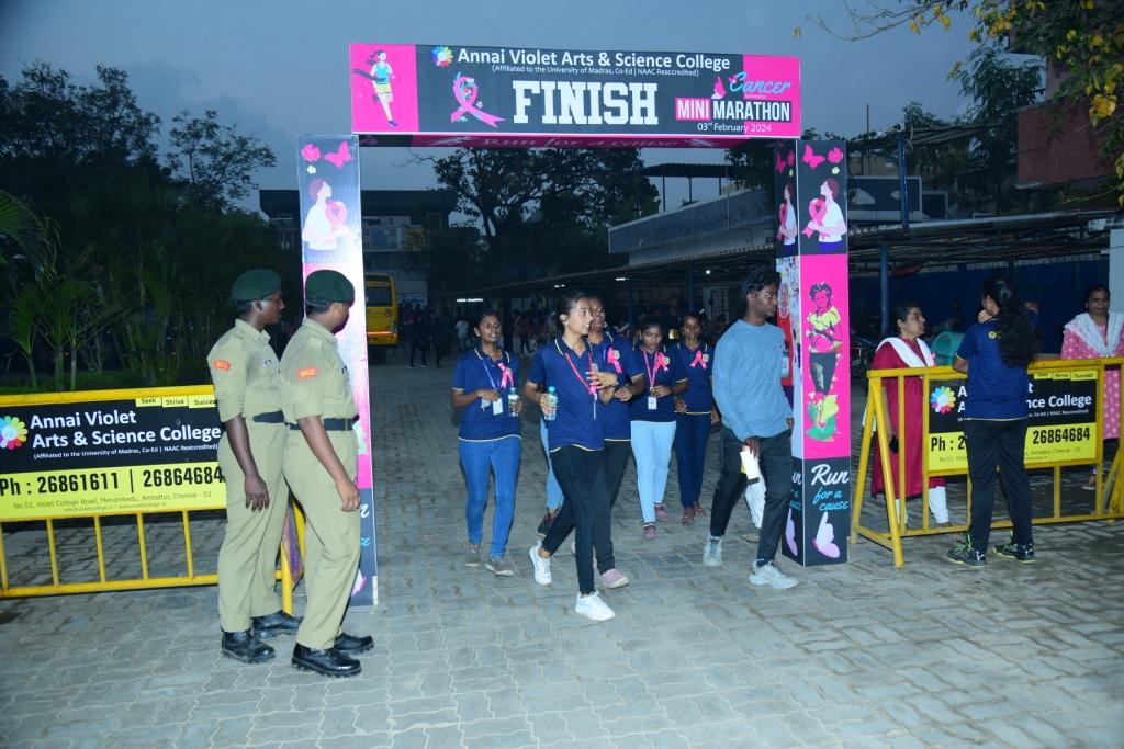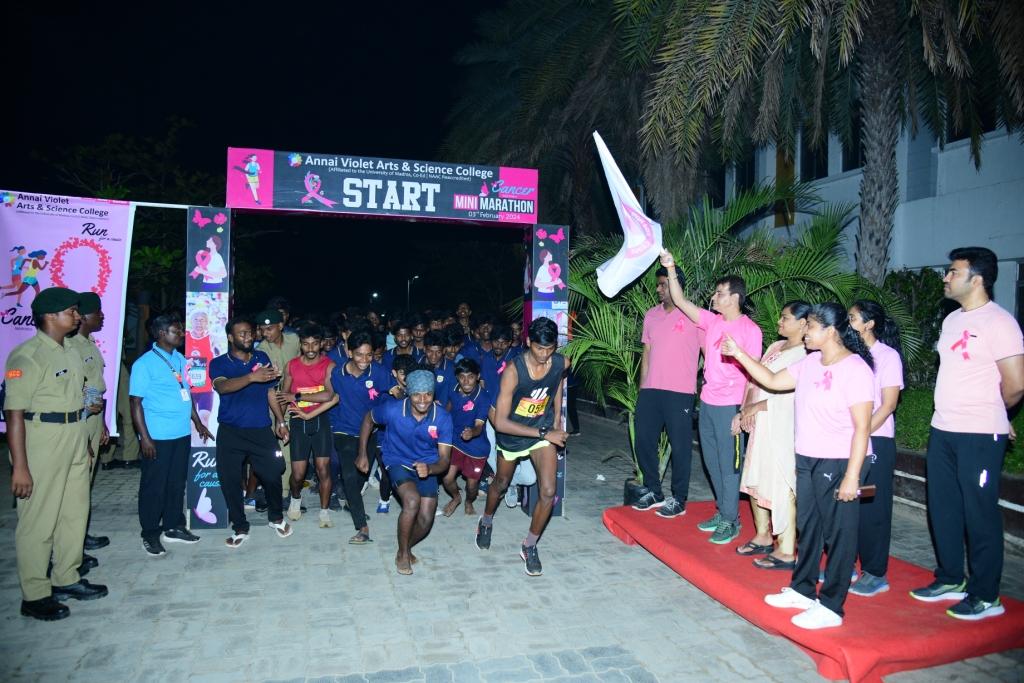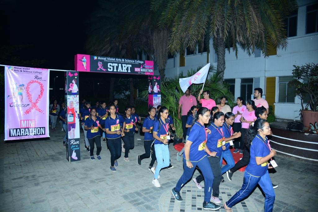 A successful Mini-Marathon, ‘Run for a Cause’ was organized by YRC & RRC of Annai Violet Arts and Science College on Saturday, 3rd February 2024, to raise awareness about cancer among the public. The primary goal was to educate and encourage a healthier lifestyle while emphasizing the importance of early detection and treatment.